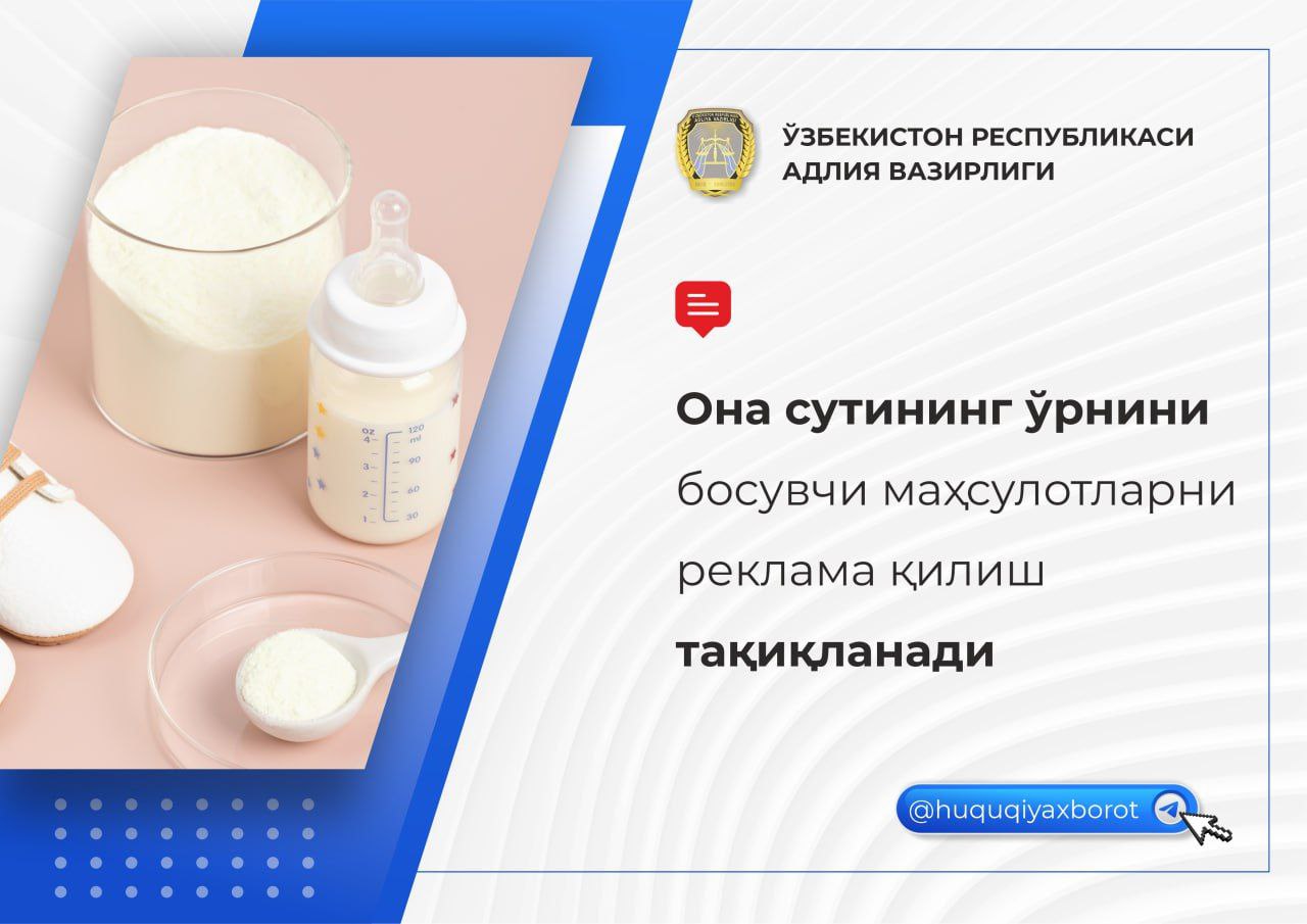 #bilasizmi Go‘daklar va kichik yoshdagi bolalar oziq-ovqatlari reklamasi quyidagi talablarga mos bo‘lishi shart: ona sutining o‘rnini bosuvchi mahsulotlarni reklama qilishga yo‘l qo‘yilmaydi; (https://t.me/huquqiyaxborot) ❕ona sutining o‘rnini bosuvchi mahsulotlarga oid axborotlar go‘dakni 6 oygacha oziqlantirishda ona suti bilan oziqlantirishning foydasi...